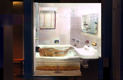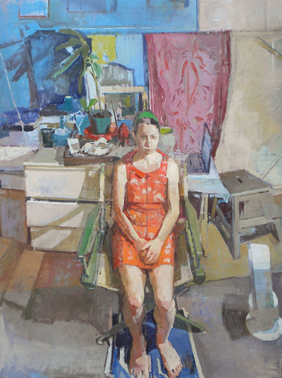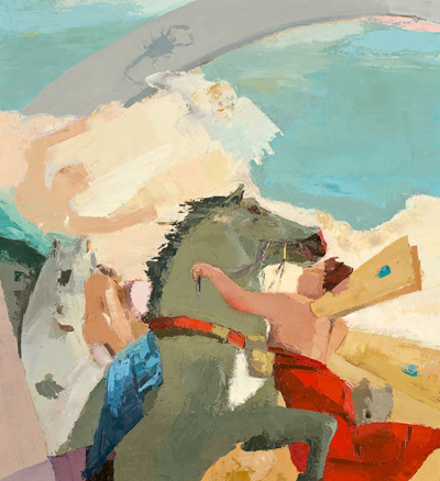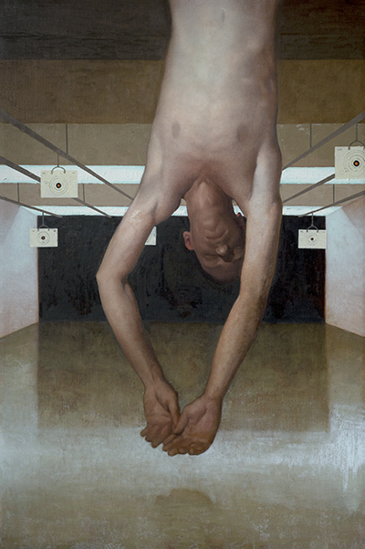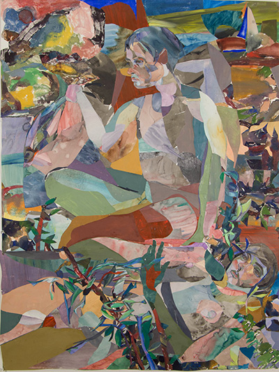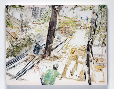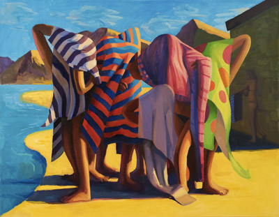 "A swimmer is momentarily blinded while drying his face and unwittingly stumbles over sunbathers. A man with an inner tube tries to insert himself into a crowded group of strangers in a swimming pool. These humorous subjects are a foil for the formal explorations of the work. As each piece develops, they become pictorial inventions that resist, complicate or disrupt the narratives. In particular, I am looking for a formal poise careening toward imminent disaster. This is amplified by various motifs in the paintings that play graphic clarity against spatial ambiguity, formal precision against awkward form. A recurring theme is the tension between the seen and the unseen, both from the point of view of the viewer and the subject. All of these devices are employed to activate the paintings in a surprising way that is interdependent with their original narrative impetus.