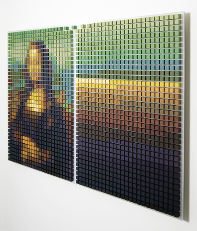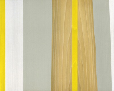 Portions of these paintings are made through a cumulative process similar to that of a dot matrix printer. Small, individual strokes or bands are painted in a regulated and mechanical fashion that forms gradients through minute striations of individual colors. These gradients become conveyor belts, moving planes of space with color. Multiple underlayers of contrasting color amplify and complicate chromatic relationships on the surface, and create an internal luminosity reminiscent of the screen, as painting chases the digital aura of the original image.
