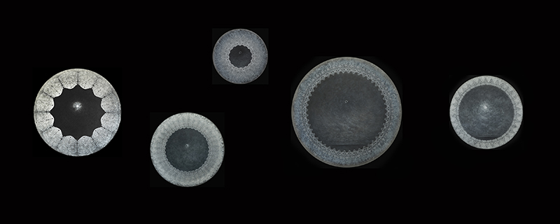 Many Moons Of her work the artist states: "In my work I desire to create a generative space that tethers us as one in the vastness of the cosmos and the voids between, communicating what cannot be seen but felt – the vibrations that are part of us all, echoes from billions of years ago.... As a “conceptual voyager” I play with cosmologies created when scientists and artists imagine, making work that posits, as George Johnson suggests science does, “…a glorious human construction, an artful fitting of the data into a carefully crafted mental framework, a construction of towers that just possibly might have been built another way.” I hope in my work to create a shimmering body of work coalesced in the uneasy thin space between what I do and don’t yet understand and the erotic dark energy threading me to all.”