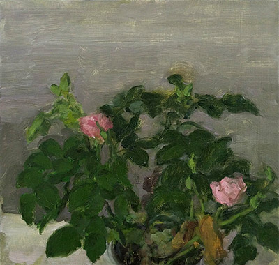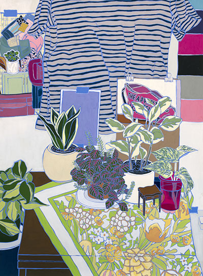 Of her work the artist states: The pictorial relationships, which reflect both the past and the present, are laden with time and memory. Each constructed space creates room for confusion and contemplation. Through playful patterns, furniture, and an ever-evolving collection of plants, these paintings engage with internalized expectations of traditional feminine roles as I consider my life in comparison to the women in my family who came before me. This navigation of generational history and individual experience serves as the starting point for an ongoing exploration of identity and the process of settling into one's self. "