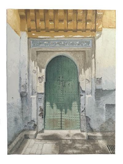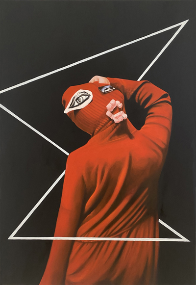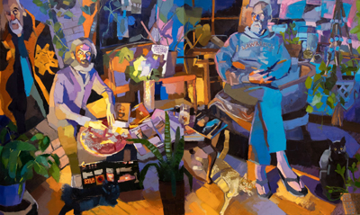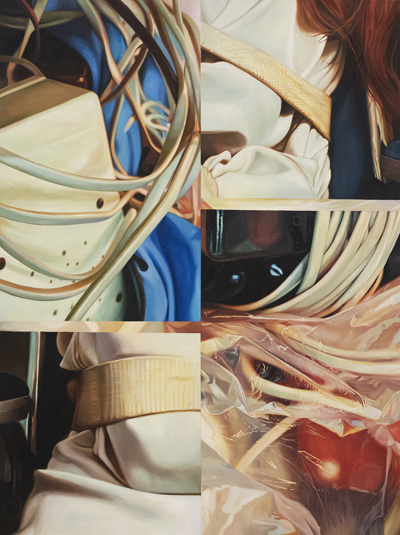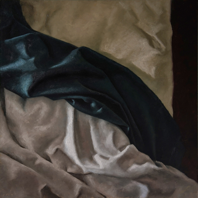 Of his work the artist states: "The T-Square in this painting belonged to my grandfather William Schickel whose modern artistic career spanned architecture to photography sculpture and painting. I never saw a traditional office space as a kid but my grandfather’s studio with its rulers, tracing paper, paint and bent metal was my example of what a working person looked like. Always busy, my grandfather’s mantra was art is life—life is art, which fit a moral view of the world informed by his Catholic faith. Aesthetics and rightness were synonymous pursuits that I had to untangle in my own development as a mature artist, but the ease of making and looking at the world through an artist’s lens is a kind of permission I am thankful to have been given. I teach at the University of Cincinnati and have spent some time working with fashion design students. Basic materials are inherently beautiful to me, and even though I marvel at how my design students can craft and detail garments, the fabric itself is where I see the most magic. This painting is simple: expanses of gold and blue fabric divided by a T-Square. It’s not meant to be topical, but if you think it is, well that’s lovely too."