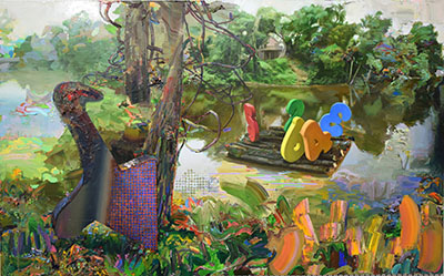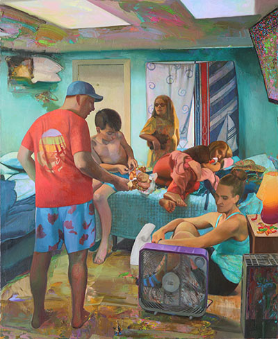 SHOOTING DAY FOR NIGHT Robert A. McCann is a Midwest-based artist and educator. Born and raised in the Ozarks of southwest Missouri, he developed his studio practice through studies at Missouri State University, Indiana University, and as a Fulbright scholar based in Berlin, Germany. Of his work the artist states: "My creative work is concerned with big psychological themes like desire and loss, history and progress, entertainment, and entropy. This group of paintings comes from a period of societal strife and significant personal events over the last half dozen years. They are informed by a political landscape resistant to parody. They're fueled by the joy and terror of becoming a first-time father at middle age at the beginning of a global pandemic. For me, painting is a good vehicle for such contradictory impulses and layered experiences. As paintings are constructed over time, they gather up discrete moments that fuse and become singular. They look forward and backward. There is a multiplicity in painting as a time-based, sculptural, and fictional medium. These are not images of things that have happened; they are analogies for internal dialogues about the outside world. The paintings reflect our mind-inside-a-body relationship to society, conflating perceptions, memories, dreams, and imagination. One meaning of “Shooting Day For Night” is the movie-making process of simulating night scenes in daylight. I take a cinematic approach in staging and composition of painted events, framing and lighting to effect. My imagery is initially sourced from YouTube videos, personal photography, scale models, digital 3-D scans, and AI-generated places and characters, selectively collaged together. The distortion of reality into considered fiction is both a search for meaning and a way of coping.”