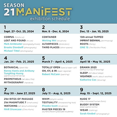 WE WOULD LIKE TO THANK YOU, AND ALL THE DONORS TO OUR ANNUAL FUND, FOR A WONDERFUL 21ST SEASON! PRE-ORDER THE MANIFEST EXHIBITION ANNUAL PUBLICATION DOCUMENTING THIS SEASON, MEAs21, HERE! SEASON 22 OPENS ON SEPTEMBER 26TH!