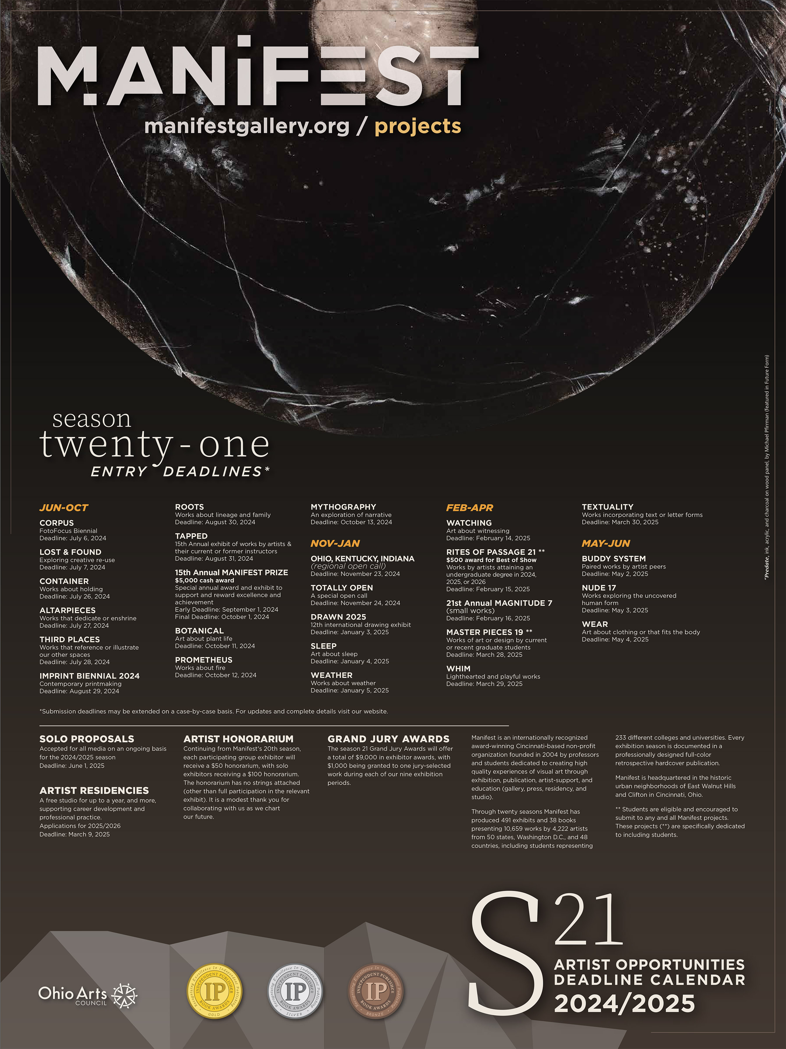 the Ohio Arts Council, and through the generous direct contributions of hundreds of individual supporters and private foundations who care deeply about Manifest's mission for the visual arts. |