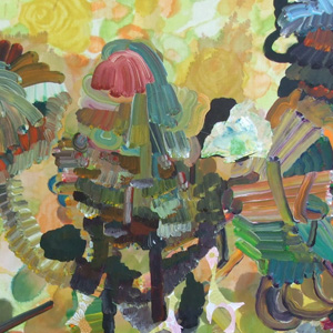 I paint on old floral bed sheets, which are worn and faded from years of dreaming and washing. I find comfort in the predictability and familiarity of the floral patterns, but I also see these patterns as visual representations of tired but unquestioned traditions. In my work, the floral patterns are disrupted, restructured, and buried by my own improvisational visual language. From conception to death, the surface of a bed is a place where one both experiences and escapes reality, a physical link between dreaming and waking life. My paintings are meant to actively depict the excitement found in questioning examples of conformity and the potential found in sleep‚s disorienting ability to wipe away a person's physical location in time. But once the film of sleep has cleared, the predictable patterns of every day fall into place, reminding the sleeper of the present and all of its habits.