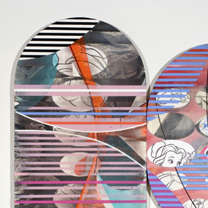 My work utilizes a largely abstract visual language, bringing disparate physical and conceptual elements into the same context. I often combine commercial images, graphics and text with painted forms of my own invention. As these multiple elements are modified and altered through both, the physical reconstruction of forms and compositional decisions, a larger aesthetic constellation is created. In working in this manner, I hope to reanimate the symbols and narrow classifications we live by and the accompanying, often unaesthetic solutions we find in the world.