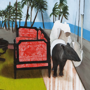 These strange worlds of artifice are constructed with images in images: odd compositions and disintegrating spaces that balance between an illusion of depth and an abstract flatness. The paintings create a complex environment that draws the viewer in with its spectacle of colour and decoration, and then alerts them of something amiss through a signifier; the miniature zoo animal. The animals are presented as domesticated, motionless and foreign in these theatrical rooms that gives a combined impression of displacement and dislocation. The environments in turn create a new and unsettling space for the imagination to contemplate the artificiality of zoos and our homes and question the way we present our selves and wild animals.