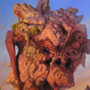 The figures in my paintings offer themselves to be felt; their vulnerability as flesh is bared and opened. Orifices and protuberances create sites at which the skin outside meets with the skin inside, forming a continuous passage between the two that eradicates their distinct positions. These grotesques become border creatures, defined by indeterminate boundaries that merge, overflow, and extend into the surrounding landscape. Despite their potentially alienating monstrosity, these characters strive to connect with each other and their environment. Their acts of singing, loving, whistling, stargazing, and wandering suggest attempts to become united with their surroundings through a state of perpetual wonder. As these characters achieve such unity, the world that opens itself to them is one full of growth and decay, shifting and transforming with their every extension. My work shows death as integral to the world of these border creatures. Rather than celebrating death itself, however, I seek to make bearable a recognition of its deep connection to life. It is in this hope that I offer an exploration of the body as open, vulnerable, and on the threshold of boundlessness.