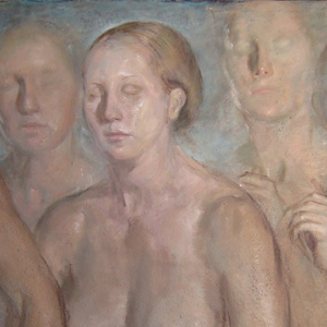 The human form, through its contours, texture and the stretch of skin over muscle and bone, conveys an emotional and philosophical aesthetic that is the driving force behind my painting and drawing practice. This aesthetic finds expression in the depiction of tactility: the painted or drawn body presented closely within the viewer's personal space and giving the viewer a sense of being able to touch the rendered flesh. By reworking an image numerous times, either by scraping off paint or erasing drawn marks, an expression of tactility emerges through the ghosts of previous images. The subtle remnants of modeled forms, desaturated or grayed colors and blended or smeared marks reduce the depicted body to the essence of its construction. The painted body now merges with and emerges from its aesthetic environment. It is anchored both in reality (the form observed from life) and imagination (its existence and meaning bound to the paper or canvas and painted or drawn marks out of which it appears). Defined by its aesthetic environment the body becomes emotive and narrative. At this point in the development of a work there is a feeling, on my part, of commitment to the image and a fidelity to the story that is presenting itself. The focus is fine-tuned and extraneous elements in a work are removed. The figure is the central means of realizing the narrative, working essentially with form as a means of communication.