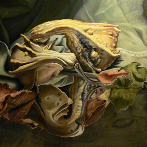 The painting "Animal or Vegetable l" is one such of example of these inquiries. It represents a beginning series of personal work that has grown out of an earlier collaborative project entitled "Crop Circle." The "Crop Circle" project was a community based art endeavor that involved promoting awareness of local farmers utilizing organic processes. Formally I am interested in the destabilization of the perceptual space contained within the still life. This specific variety of gourds, which have been hybridized throughout history for their vibrant color and diverse forms, are of particular interest as a subject to me. My choice in observing their condition in a state of decay, is a subtle insinuation to the to the current manipulation of food crops by genetic modification. The figurative quality of the vegetable metaphorically destabilizes one's perception of what is plant and what is animal. As with all of these initial visual inquiries it remains to be seen what narratives the painting chooses to bring to surface and where they will evolve from there.