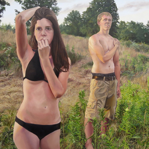 My desire to explore the human experience via the metaphor of landscape led me to include figures within nature. I hope that the viewer reads these as metaphysical senses of place. The natural landscape serves as a backdrop to moments of human action, but the emotions conveyed tap into grand, universal themes.