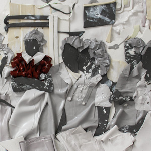 In construction, the works often take on three-dimensional forms with varying textures and colours. I usually base the colour of my paintings on the original magazine photos, but de-saturate them ñ emphasizing the shapes in the image and the texture of the paint.