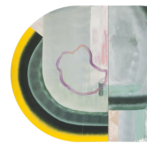 Volte-Face (Turnabout) is the title of the diptych the technique of which is integral to my pictorial approach, that of gestural abstraction. Only here, I import markedly lyrical gestures and elements more from optical painting, such as vibration of colour that recall but are not in obeisance to the razzle-and-dazzle of classic op. I do employ coloured bands with the juxtaposition of vibrant and contrasting colours.†Surfaces are worked through a network of progressive nuances and gradations. I seek out radical gestures that act as counterpoint within the overall spatial organization.The two panels are spatially discontinuous but are united by their chromatic fusion to form a single work. The bands on the left generate a planar view while the right yields the effect of a demi-sphere.