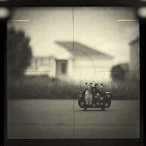 This particular work is taken through the view finder of an old camera: my wife and I are taking a break from a busy day.