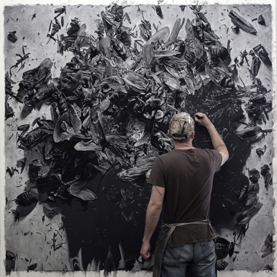 "In these large-scale drawings, I am formally exploring the visual tensions between representation and abstraction, as my observed subjects, masses of black plastic trash bags, piles of cockroaches and sculptures of diapers invoke the sensibility of a Rorschach test for viewers to contemplate. On a conceptual level, it cannot be denied that these subjects also have in common connotations of disposability, decay and, most notably, repulsion, especially for me, as they are manifestations of personal fears and anxieties. The drawings themselves are meticulously rendered to convey the opposite, to be objects that are sumptuous and attractive for the audience, and the act of rendering those things in such scale and detail is a form of individual catharsis. The inherent contrasts between light / dark, representation / abstraction, and attraction / repulsion may call into question what we value in art and in a broader cultural context. I believe that my work fits into the ongoing dialogue that elevates the mundane, the ephemeral or the vulgar to a higher status thereby reflecting parts of society that we often refuse to acknowledge in the mirror of traditional norms.
