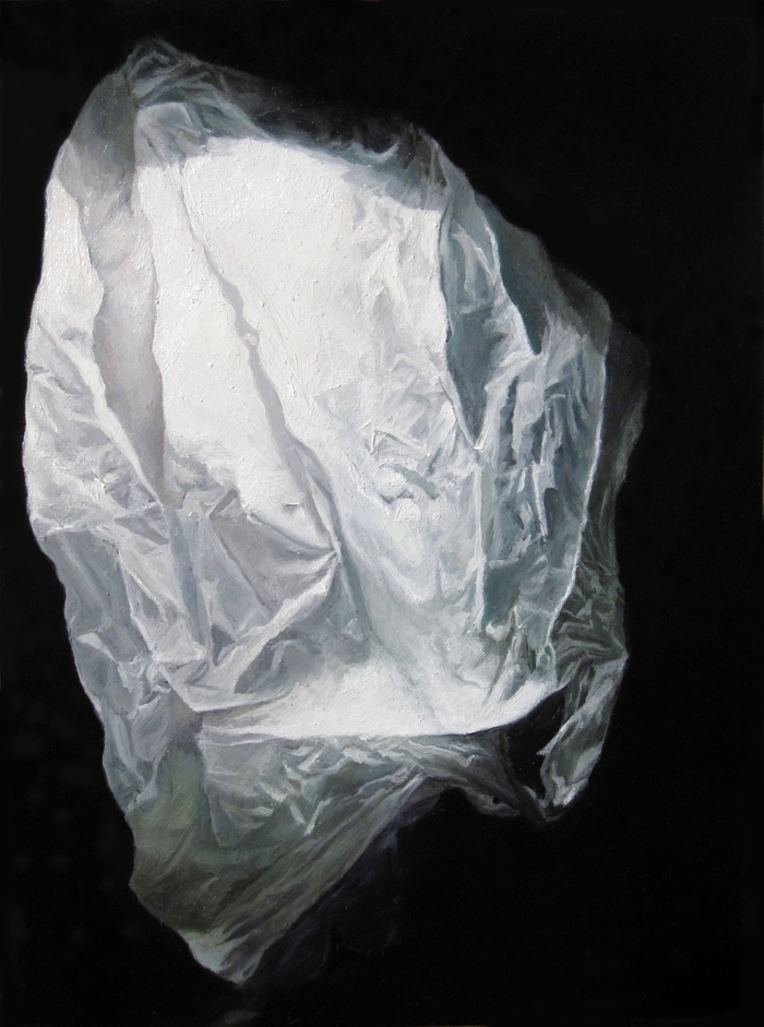 Regardless of the media, I enjoy the mood and atmosphere created by light's interaction with space or objects because it paves way for beautiful and insightful metaphor. Recently I have been working with plastic grocery bags, bicycle components, and sheer curtains. All, which when illuminated with light, become floating ghostly reminders of life and death, use and waste, or human and machine. My goal is to further explore these concepts, metaphors, and subject matter within a larger more cohesive body of work.