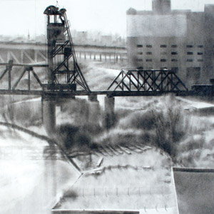 I make drawings and prints in black and white. The drawings are charcoal on paper and the prints intaglio, etching and aquatint. The subject is usually a location in Cleveland, Ohio, or its surroundings, with particular attention to the lake. The imagery is always collected with a 35mm camera and color film, which seems to offer more information from which to choose. Although I use no photomechanical or tracing process, photography plays an important conceptual role, enforcing an implacable objectivity that accepts whatever presents itself to the camera, without regard to human intention. Composition takes place in the studio, where the images are cropped or combined in the process of drawing.