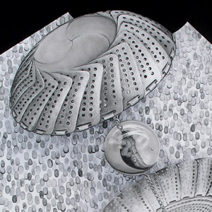 Looking at a sonogram image can be like looking through a perforated screen. The image of a child may become perfectly clear in a moment, then lost in static in the next. Before my daughter was born her placenta detached form the uterus, and as a result many sonograms were made to monitor her progress. In response to these images I began a series of prints and drawings that explore this concept of thinking about the unknown while looking at coded or veiled information. In these works an equally familiar and confusing object is a surrogate for the pre-born child, and peripheral information seeks to attract a sense of context. In all of these images there is an interest in the absurd, the unnoticed, the unfathomable, and an unconscious wisdom.