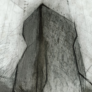 My work focuses on the tensions created within the contrasting forces of rootedness and mobility, transparency and opacity, legibility and confusion, and surface and depth. I explore these issues both in acrylic paintings where layered textures and images combine to form surfaces of worn history; and through work with graphite, paper, Mylar and Plexiglas, where I often hide and reveal images of entangled and knotted forms. As a balance and reaction to the organic imagery, I also explore ideas of construction, time, and ruin through drawings of imagined manmade monumental forms. The works included in the 2008 iNDA come from this architectural series of drawings. They are built up gesturally with no plan for the final form, allowed to evolve and grow (much like the organic imagery), and then worked and reworked until enough time has passed to give them a sense of individual history and wear. Through choice of imagery and process, each body of work examines different parts of the ongoing cycle of germination, growth, expansion, decay, and renewal.