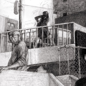 In my recent drawings I concentrate on the remembrance of direct observation as a vehicle for exploring the relationship between memory and pictorial expression. In a struggle to infuse my images with meaning, I have found that constantly revising and changing compositions in mid-process poses the risk of failure yet creates a dialogue between the artist and the work that constitutes the basis for effective visual communication with the viewer. Drawing on my experiences of living in Japan, then changing views while living in Southern California, and now in my current location of Kentucky, I choose ordinary people and their environments as subjects to initiate my research. By focusing on the unique gestures of human figures and amplifying urban settings, I experiment with shifting points of view to establish a new context for daily visual experiences and to engage the audience with points of view outside the scope of everyday life.