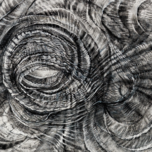 In this large ink and graphite drawing, vigorous mark making captures the energy of creation. The rendering of transparency and movement accelerates the slow process of shell formation into a condensed period of time.