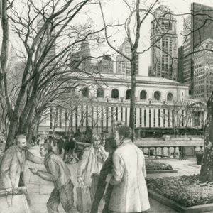 "Meeting in Bryant Park" belongs to an ongoing series of intricate landscape drawings with figures appropriated from masterpieces of art. Past landscape drawings included contemporary figures from multiple photographs of the same space as the landscape image. The figures were used as compositional elements establishing scale or emphasis. To the viewer, these figures were passing strangers offering no engagement. While the appropriated figures in this work continue to be important compositional elements, their historical significance and visual meaning create a more complex relationship between time and place.