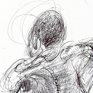 I have always been fascinated with the idea of movement and using gesture drawing to explore the human form. Drawing quickly leads to unpredictable distortions and taps into something primal that exists in all of us. The structural marks clarify the figures and provide the composition with a sense of order, just as these fighters are being controlled and contained in their environment.