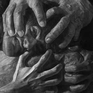 My drawings consist of visual narratives that explore the human condition in all of its complexity, fragility, grandeur, horror, absurdity, comedy, and beauty. Many of my drawings are based on stories written by Franz Kafka, who of all of the authors I've read, explains the nature and motivations of human beings in the most psychologically incisive way. My drawings are also based on my own writing, and on accounts of genocide told by survivors. My composite photorealistic style permits me to tell stories in a clear, accessible, precise, and dramatically compelling manner. Instead of drawing from a single photograph, I work from a variety of photographs integrated into a purely invented image. In this way, an imagined or remembered subject becomes hyper-realistic and believable. Composite photorealism creates a broader range of narrative possibilities than single-source photorealism because it allows me to use my imagination when combining a number of photographs to tell a story.