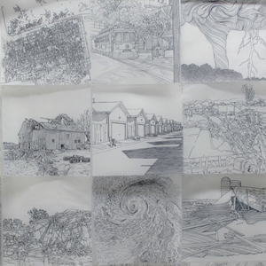 Drawing is my focus, and presenting my hand in the work is important to me. By representing the details of experience, the everyday, and the left over pieces, I feel that I can preserve my culture, family, memory, and experience. Most recently I've been visually and conceptually interested in exploring the patterns found in storm imagery. The devastation of recent natural disasters and the humanly unstoppable forces that created them both frighten and fascinate me. Ironically, images of storm mappings, waves crashing, and tornadoes twirling are often beautiful and mysteriously intriguing. I call it the beautiful monster affect. Piles of rubble are also prominent in my current work, both those literally found "after the storm" and those that I have constructed through collaged and invented imagery.