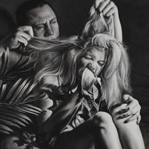 My work is structured through realism in conjunction with elements of surrealism. The large-scale charcoal drawings aim to create a unique environment for the audience, evoking a flux between attraction and intimidation. The rendering and gaze of the figures are meant to draw the viewer close while the slightly larger than life-sized models become uninviting, creating a sense of unease. These strange theatrical scenes are constructed with carefully selected props and composed with harsh contrasted light, to enhance the dramatized atmosphere. The images are not without comic relief; my goal is for the work to wink at the passer by. The human species is represented as being at the top of the food chain, astonishingly smart, and in charge, but in contrast also seen as a species drastically influenced by emotion. We let these emotions interfere with the way we live, act, and react.