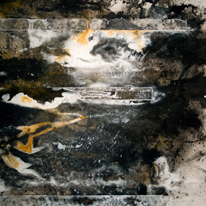 These images often begin with dividing up the picture plane by snapping down charcoal and other raw materials with chalk lines, like the ones used on construction sites. As lines amass, the surface undergoes various treatments of measured destruction. Pools of water and medium evaporate and sediment settles to cover previous layers. Grease pencils and graphite marks indicate the presence of a plan or system. Each new layer appears to have it's own logic while reaction and force destroy order. Corrosion appears in the form of iron Oxide whose reds and yellows leave a patina of change, as if a powerful natural correction fluid. No line or division seems capable of surviving.