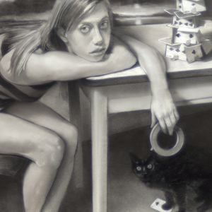 This drawing was originally intended to be a study for an oil painting, but it became an independent work in itself. (The painting that evolved from this drawing is larger; it is now at an exhibition in the Evansville Museum, in Indiana, where I was once Artist-in-Residence.) The house of cards at the heart of the still life is held together with hot glue and masking tape: sloppy expedients that postpone its proverbial, inevitable, destruction. It was set up in my studio for more than a year. Card houses, and card games, have long been symbols of the vanity of human effort. Most famously, Chardin painted them. His paintings of youths building card structures have hovered in my imagination for years. Frederick Church's magnificent painting of Cotopaxi erupting is reproduced in the poster behind the young woman. I have borrowed that many times, inserting it into any quiet interior scene that needs drama. The cat, Inky, was once a family pet, less prescient in life than he appears in this little memorial.