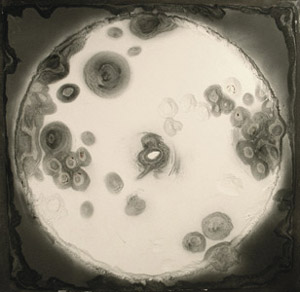 What I have tried to do is create, through a physical process, works that are hopefully powerful, contemplative, and sustainable. I look to geologic structures for ideas, so crater forms were a natural choice to work a circular format within a square picture plane-it helped me contain their shape and form. I used the craters as the primary metaphor, as I cut, sanded, abraded, and built back layers of material. Lastly, the images refer to no place specifically, but are the result of research and of looking inward.